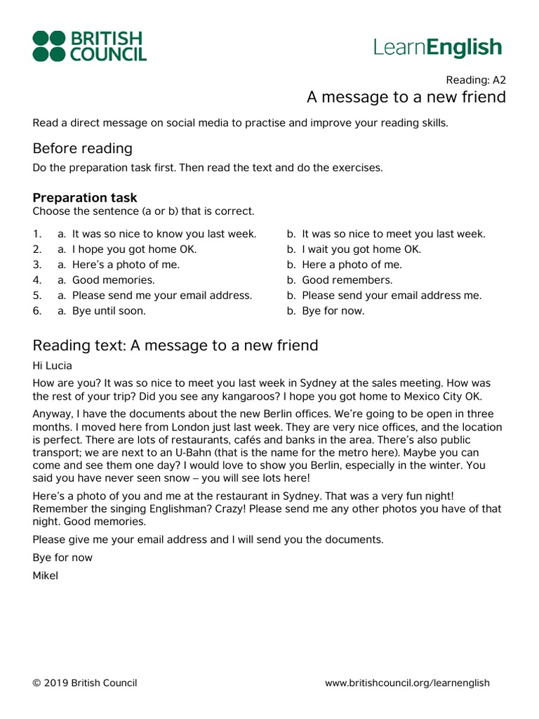 Learnenglish Reading A2 A Message To A New Friend Pdf Dochub
